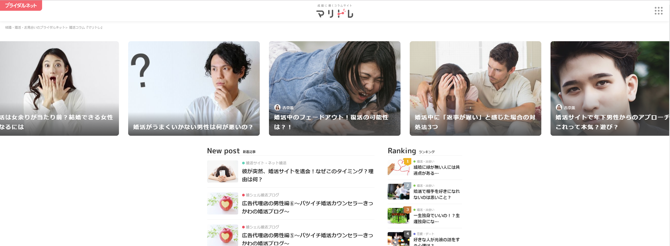 恋愛と結婚をまじめに考える婚活サイト「ブライダルネット」を運営する株式会社IBJでは、婚活コラムの「マリトレ」を運営。婚活に悩む男女の後押しするコンテンツを配信しています。 未知株式会社(以後、未知)ではパートナーとしてマリトレのコンテンツ制作をサポートさせていただいております。 未知がサポートするようになって約1年。 メディア運営についてのお話を株式会社IBJコミュニティ事業部部長の土屋さま(以下、敬称略)にお伺いいたしました。(インタビュアー:未知株式会社 澤田)
