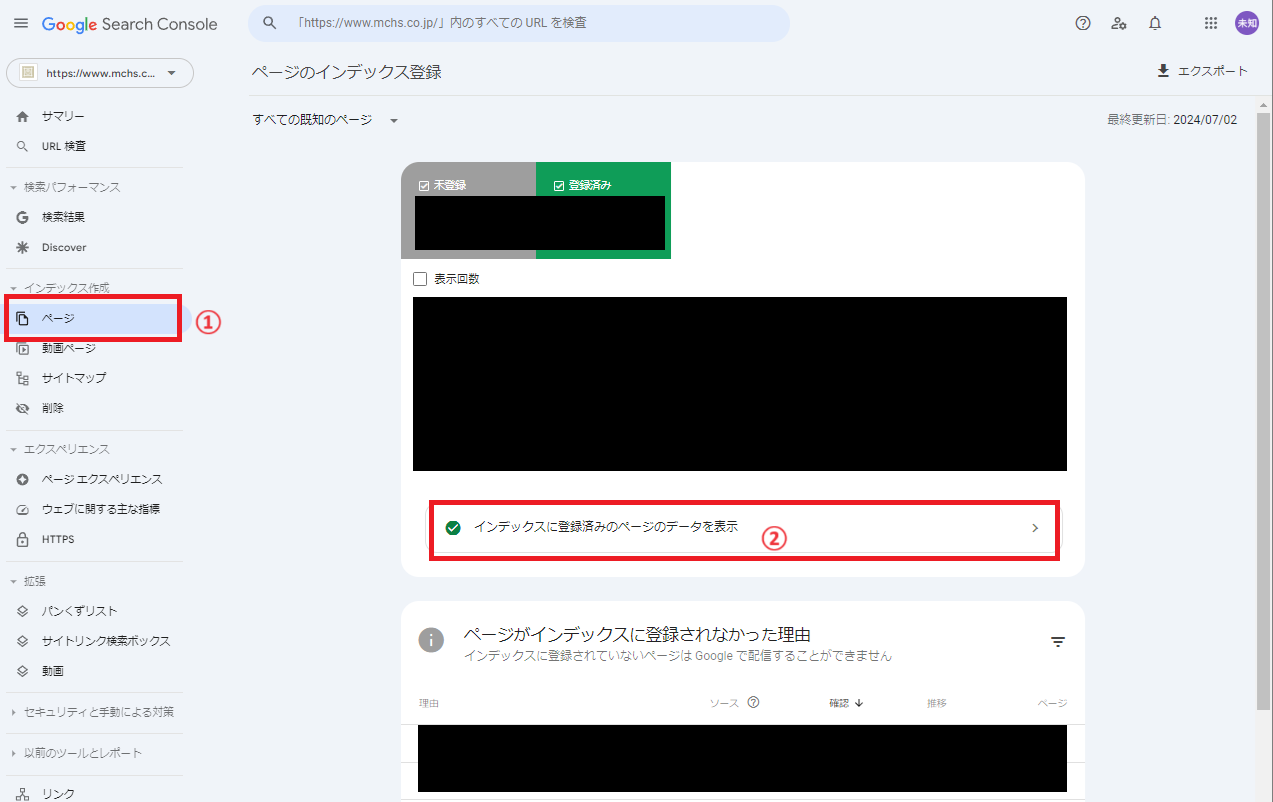 | 手順1:Google Search Consoleを開き、左メニュー「インデックス作成」の「ページ」を押下する 手順2:「インデックスに登録済のページのデータを表示」を押下する |