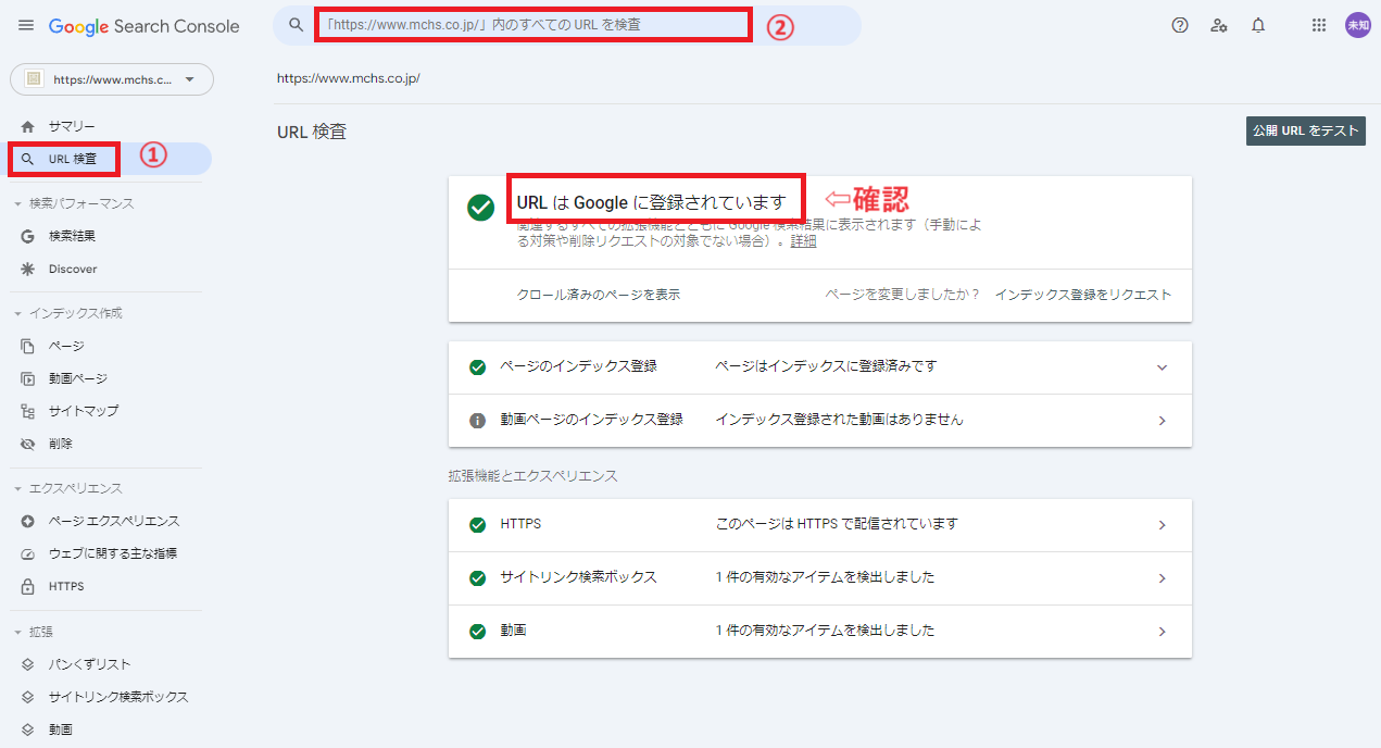 | 手順1:Google Search Consoleを開き、左メニューの「URL検査」を押下する 手順2:確認したいページのURLを検索窓に入力する |