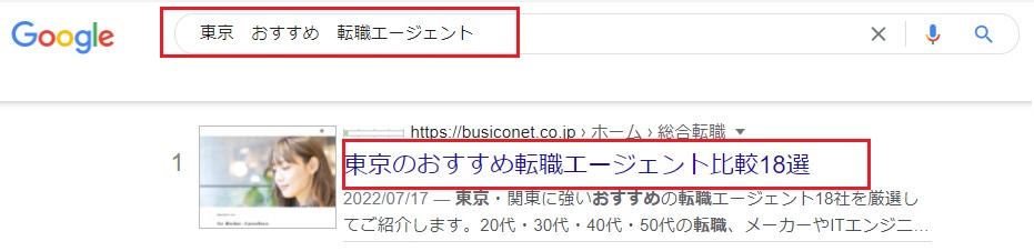 例えばユーザーが「東京 おすすめ 転職サイト」の3キーワードで検索した場合、全てのキーワードがタイトルタグに含まれているWebページが上位表示されやすくなります。