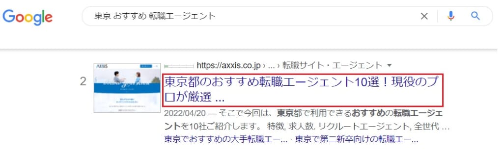 前述した事例同様、「東京 おすすめ 転職エージェント」をキーワードにしたタイトルを比較してみましょう。
