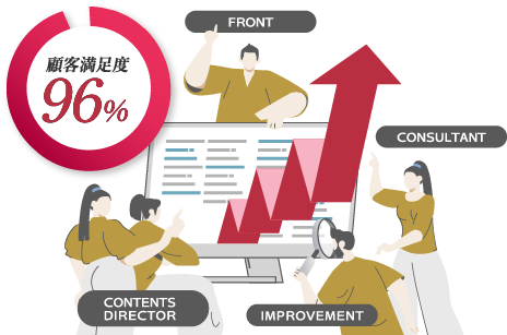 御社専属のコンサルティングチームを構築し、「コンサルタント1名」「コンテンツディレクター2名」「フロント担当および効果・改善担当」 の計5名体制で、貴社のSEO施策を徹底的にサポートします。SEOの知識が全くなくても、伴走型で寄り添いながら、結果を出すために全力でサポート。顧客満足度96%の実績を誇る専属チームが、貴社の成果に向けてしっかりと導きます。
