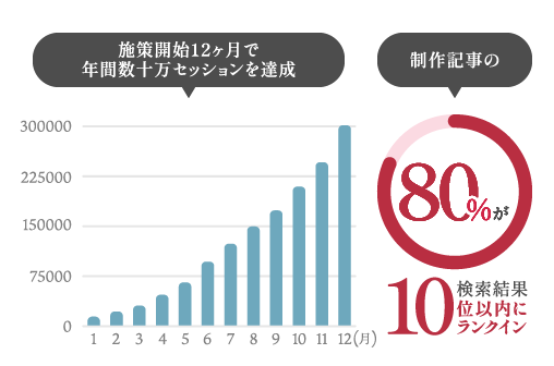 最新のGoogleアルゴリズムに完全対応し、2024年度にご支援したメディアの上位表示率は85%を達成。100以上のSEO施策の中から、貴社に最適な戦略を提案し、上位表示の獲得と維持を徹底的にサポートします。戦略的なアプローチと精緻な分析にて検索結果の競争優位性を確立し、長期的な成果へと導きます。