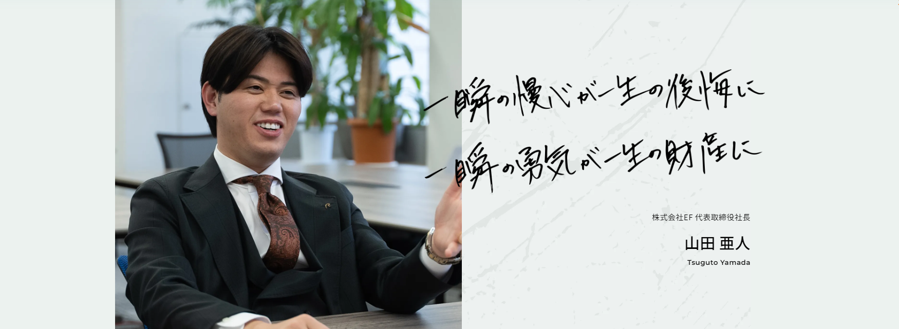 マンガを中心としたデジタルコミック広告をメインにWebマーケティング事業を展開している株式会社EF。『Rush to live. 生き急げ。』をミッションに掲げ、日本の誇る「漫画」と「Webマーケティング」を組み合わせた、新しいマーケティング手法を活用し、お客様のあらゆる課題を解決する事業を展開しています。 今回、未知株式会社はパートナー企業として、コーポレートサイトのリニューアルからMVV(ミッション・ビジョン・バリュー)コンサルティング、採用戦略の支援など、Webブランディングを中心に幅広くお手伝いさせていただきました。 そこで今回は株式会社EF 代表取締役 山田 亜人 様(以下、敬称略)に、プロジェクトの狙いと導入の成果についてお話をお伺いしました。(インタビュアー:未知株式会社 坂本)