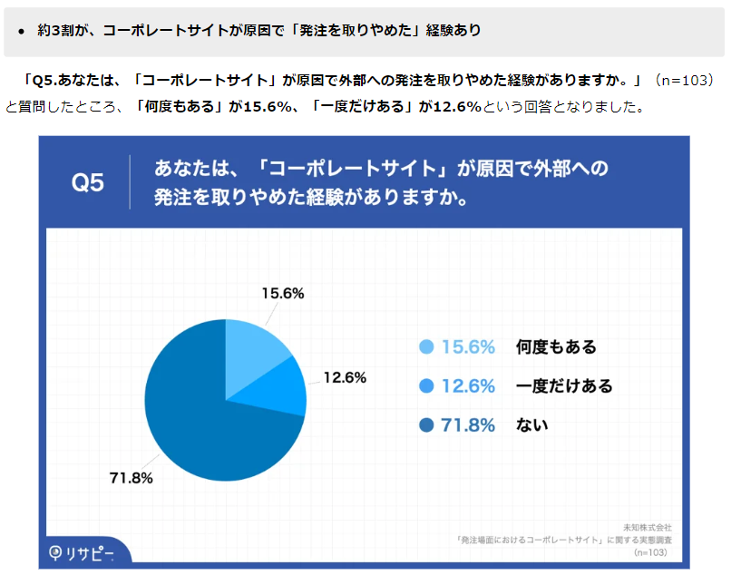 ※出典:経営者・役員の約3割が、発注検討時「コーポレートサイト」が原因で「発注するのを取りやめた」経験あり | 未知株式会社のプレスリリース
