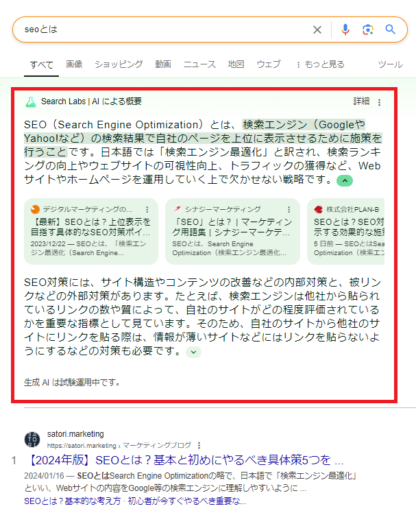SGEとは、「Search Generative Experience」の略称で、AIを活用したGoogleが提供する検索機能のことです。日本では2023年8月から試験的に導入されており、将来的に本格化される可能性があるため、動向が注目されています。SGEを有効化すると、ユーザーの検索語句に対して、検索結果の上部に生成AIが回答を表示します。