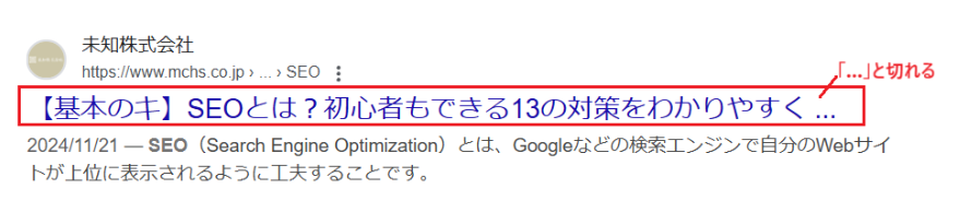 また、タイトルの文字数は理想的には30文字前後に収めるのがベストです。文字数が超過すると以下のように、検索結果に表示されてしまいます。
