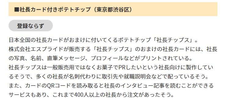 番組内では、「全国の会社の社長がよくわかる!?社長カード付ポテトチップ!」が取り上げられ、その際の紹介VTRの中で弊社、代表下方のカードが紹介されました!