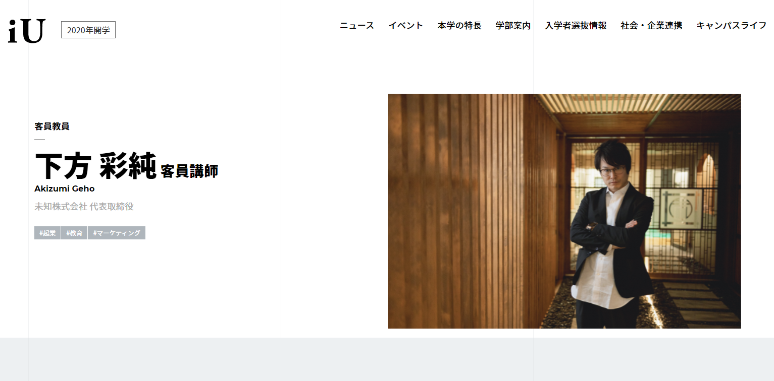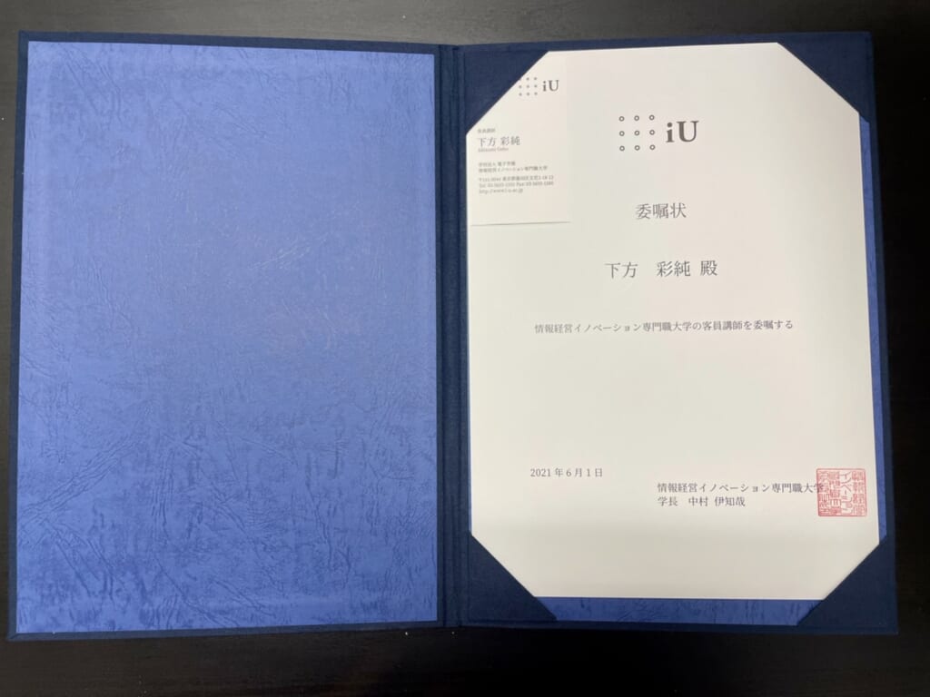 弊社代表の下方が、情報経営イノベーション専門職大学【iU】の客員講師の委嘱を受けました。